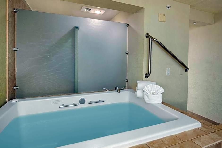 1 King Bed Non-Smoking Two Person Jetted Tub Microwave And Refrigerator Rain Shower Wi-Fi is 129 square feet and includes a king-size bed 150-183 width.